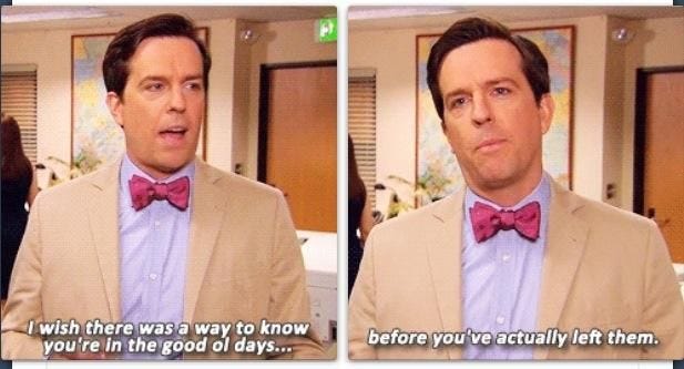 “I wish there was a way to know you’re in the good ol’ days…before you’ve actually left them.” -Andy Bernard, May 2013